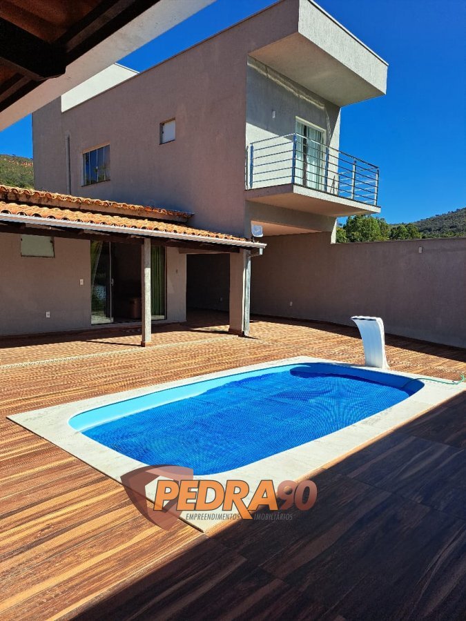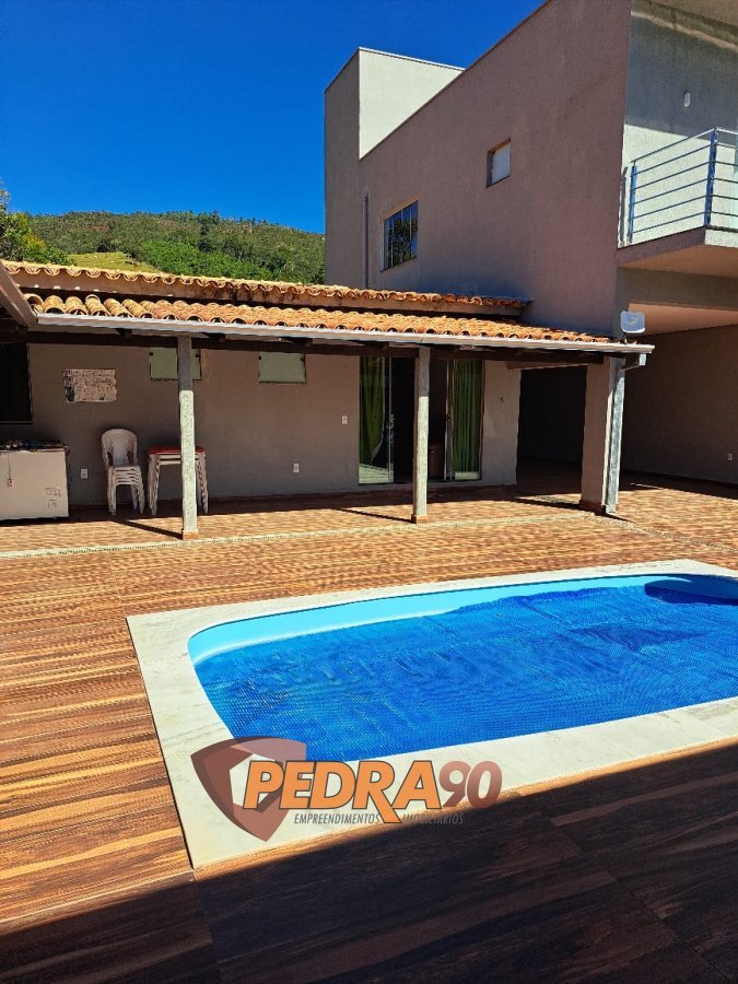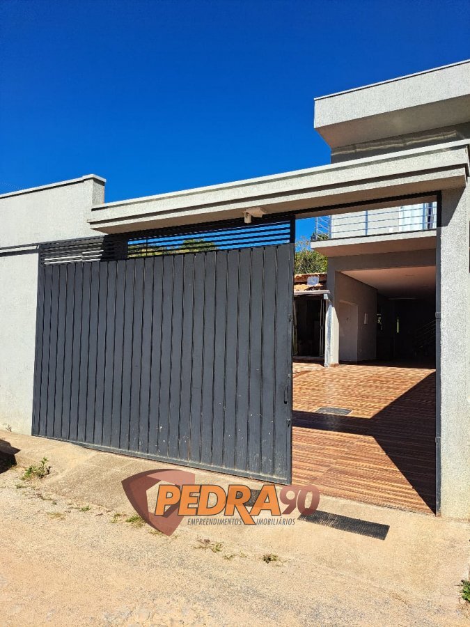 PARTE DEBAIXO:O piso da casa é todo em \"PORCELANATO\" (exceto varanda e garagem), área gourmet com piscina com cascata, banheiro masculino e feminino, fogão cooktop, churrasqueira, varanda em \"L\", freezer, 2 mesas de plástico com 8 cadeiras, 1 mesa em madeira, poço artesiano, água em queda livre, 1 mesa em madeira com 3 cadeiras, um sofá de 3 e 2 lugares, um armário de aço, um fogão de 5 bocas, lavanderia coberta com varanda, banheiro social , uma suíte com entrada para ar condicionado, um guarda roupas, um ventilador, uma suíte e doisquartos com 2 camas de casal e uma de solteiro.